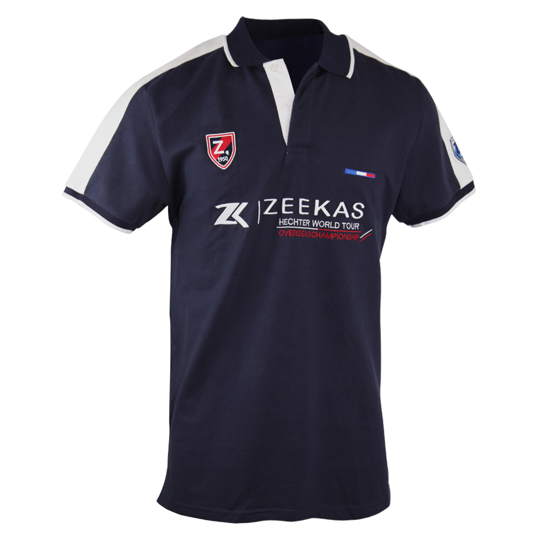 Zeekas White Stripe Pattern Mens Dark Navy Blue Polo T Shirt With Hechter World Tour Overseas Championship Print Design